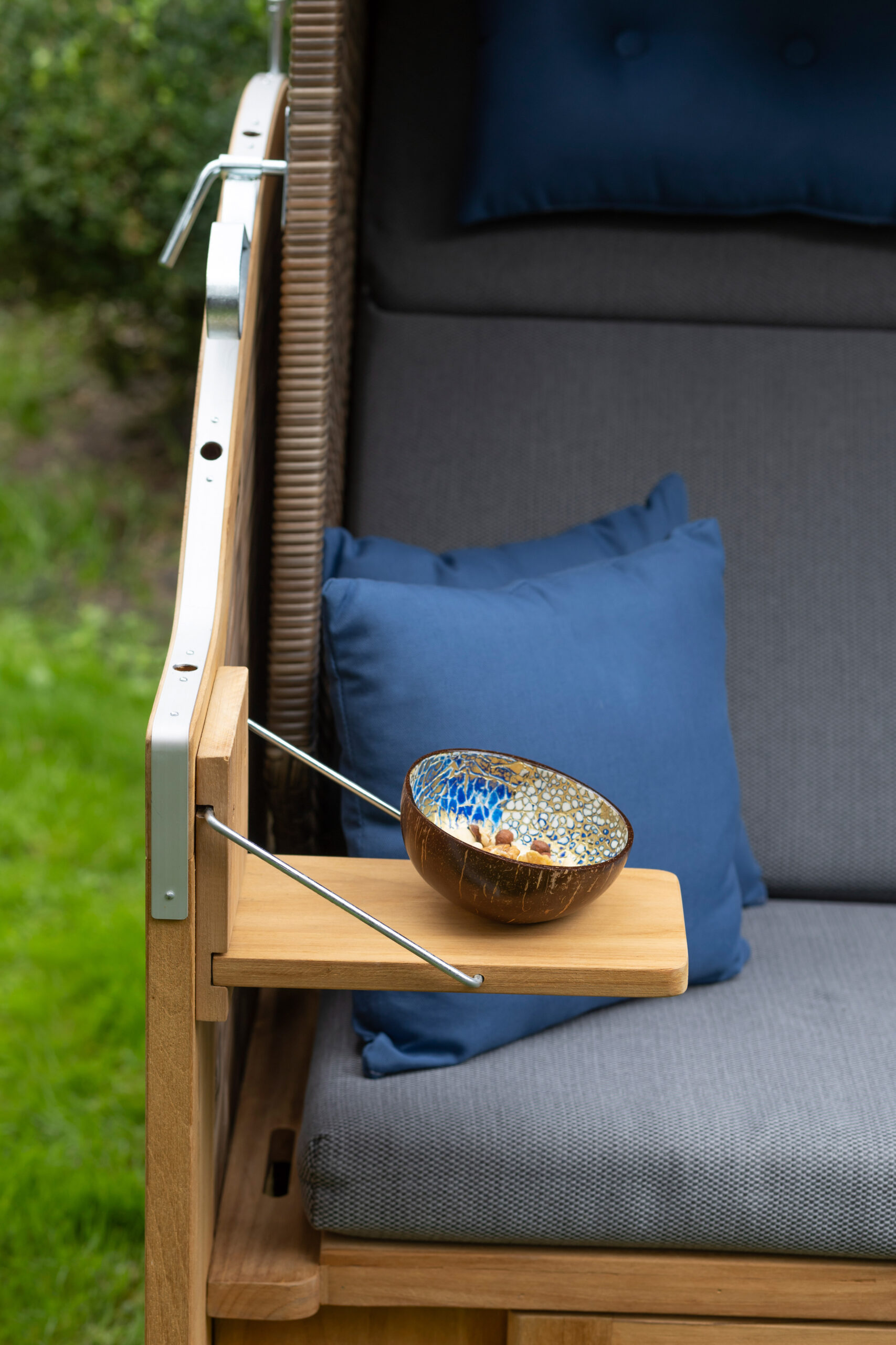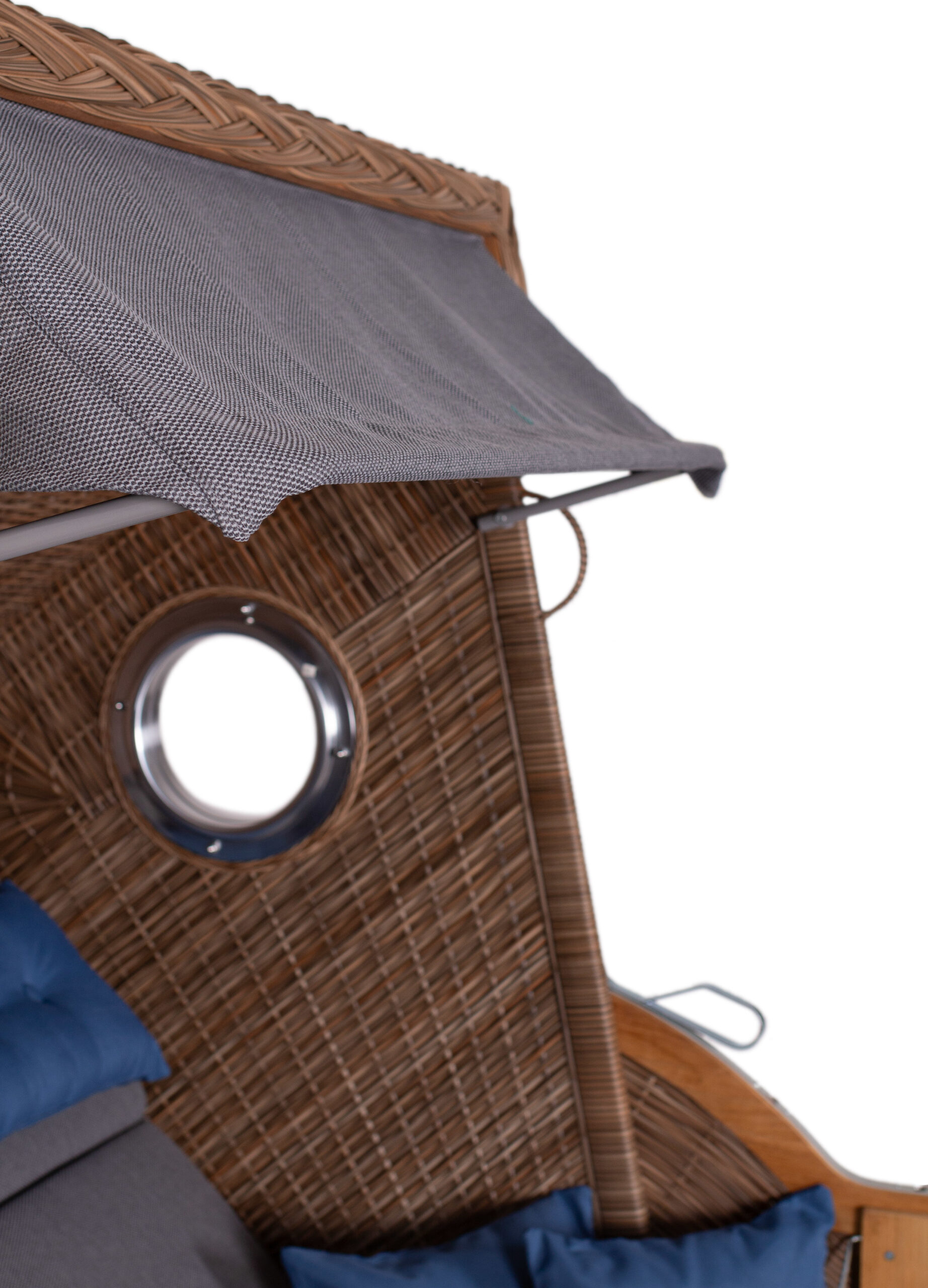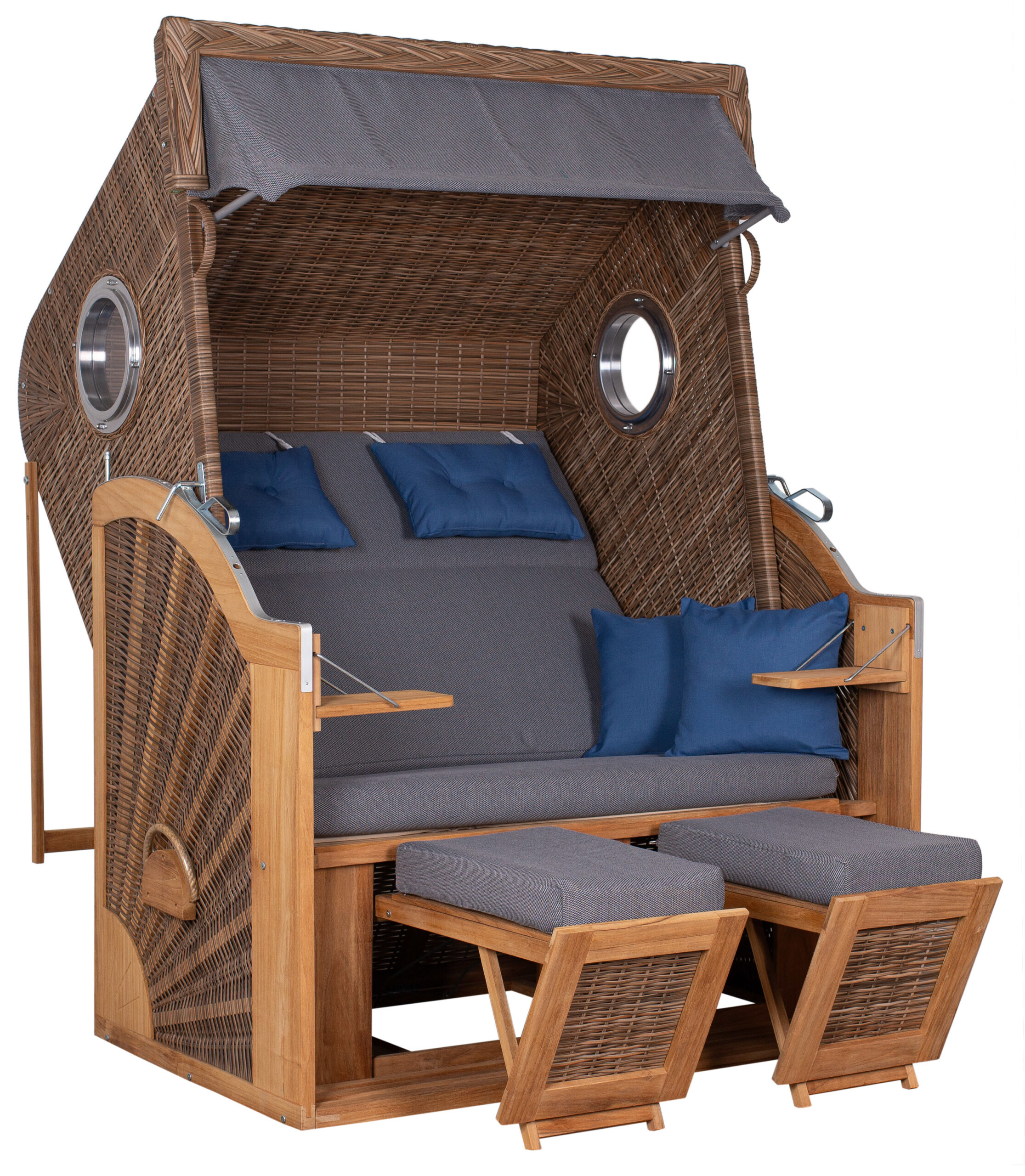 PE st. griseum Des. 486 with aluminum portholes, cushion set including two snuggle cushions, 7 mm wicker width, Teskwood brushed, with two folding tables, size approx. 1.30 m x 1.60 m.